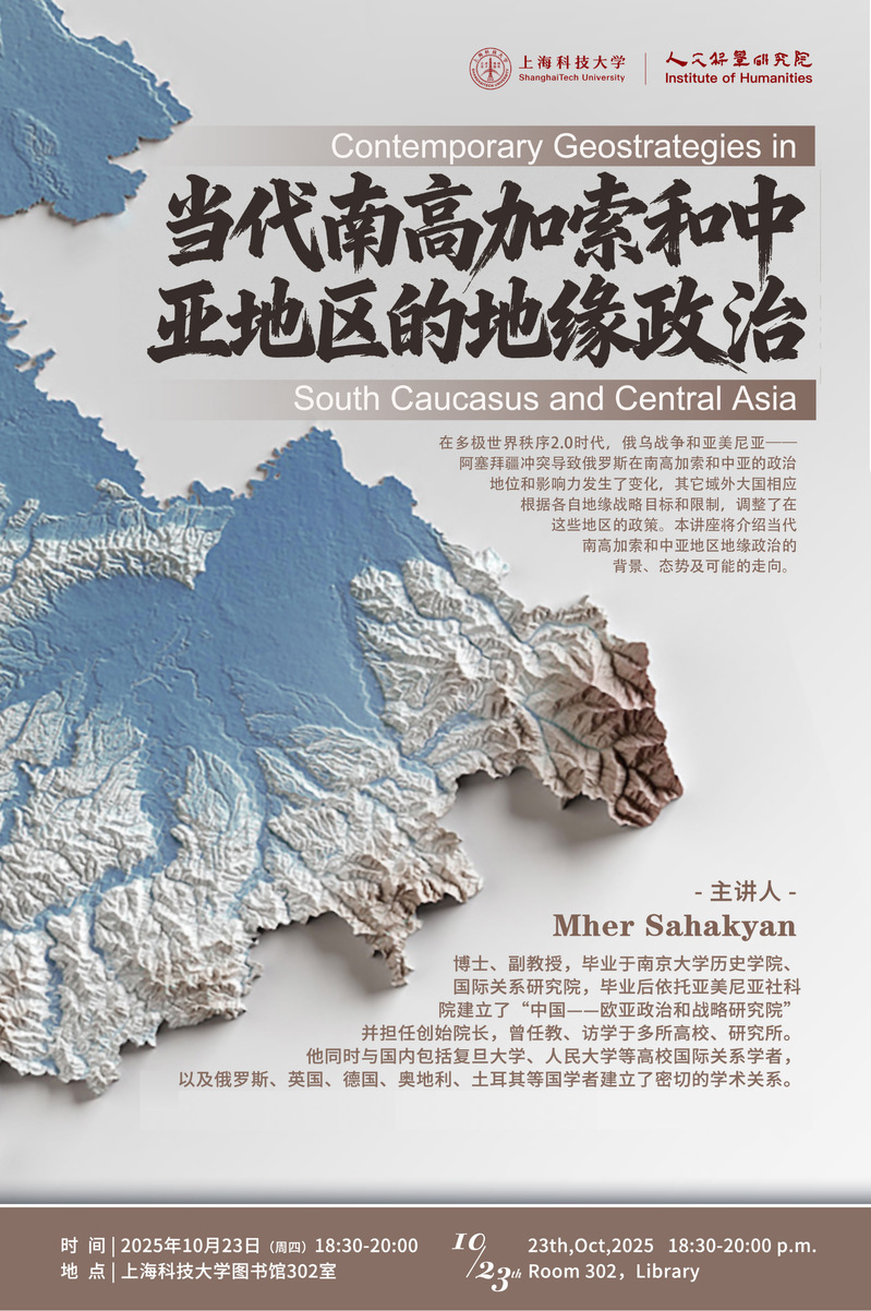 The lecture titled Contemporary Geostrategies in South Caucasus and Central Asia will be hosted at 18:30 on Thursday, October 23th, in Room 302, Library of ShanghaiTech. Welcome!